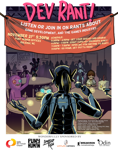 In November, we hosted the Dev Rant! event, on behalf of the International Game Developers Association (IGDA.) At Dev Rant!, local game developers could vent about any subject in the industry they wanted to, for 8 minutes at a time. To our surprise, the event had a larger turnout and was more fun than we expected, and look forward to hosting again.
